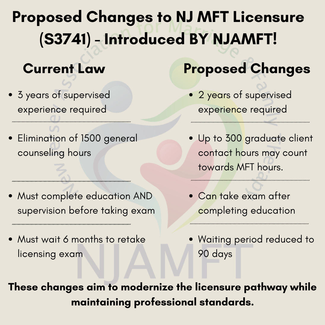 We are pleased to share that with the support of AAMFT, NJAMFT has worked with legislators to introduce Senate Bill S3741, legislation designed to modernize the licensure pathway for Marriage and Family Therapists in New Jersey.
